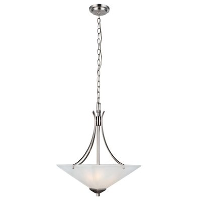 The Design House 514810 2-Light Torino Large Pendant features a satin nickel finish and snow glass for a soft, elegant accent in kitchens, hallways or dining rooms. The squared glass frame and upward facing mount give this pendant a modern aesthetic, which matches traditional furnishings. Match this light fixture with granite countertops, colorful walls and stainless steel appliances. This fixture will quickly update your home with its modern appeal. This large pendant is UL listed, has 120-volts and features two 60-watt medium base incandescent lamps. Read more